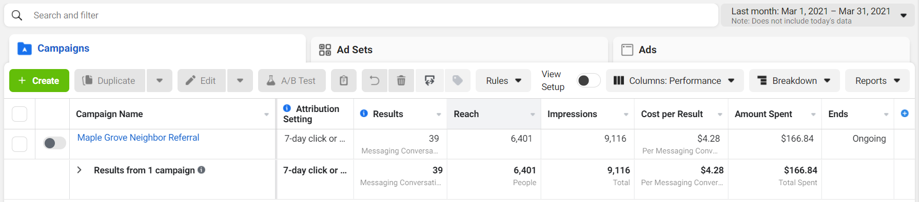 With the most common campaign set up we use (FB messaging campaign), these ad clicks directly start a conversation in messenger between your facebook page and the customer on your companies Facebook Messenger chat.